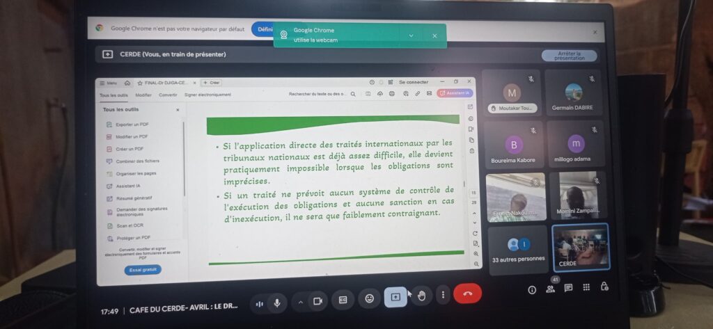 Le principal discutant de ce numéro du Café du CERDE, en la personne du docteur Germain DABIRE, enseignant-chercheur à l’UFR-SJP de l’Université Thomas Sankara, a soulevé les principales problématiques en lien avec l’intérêt, les enjeux et l’actualité du sujet. Globalement, ce dernier, dans un argumentaire basé sur des éléments jurisprudentiels et conventionnels, a souligné la pertinence de l’analyse faite par le docteur DJIGA.